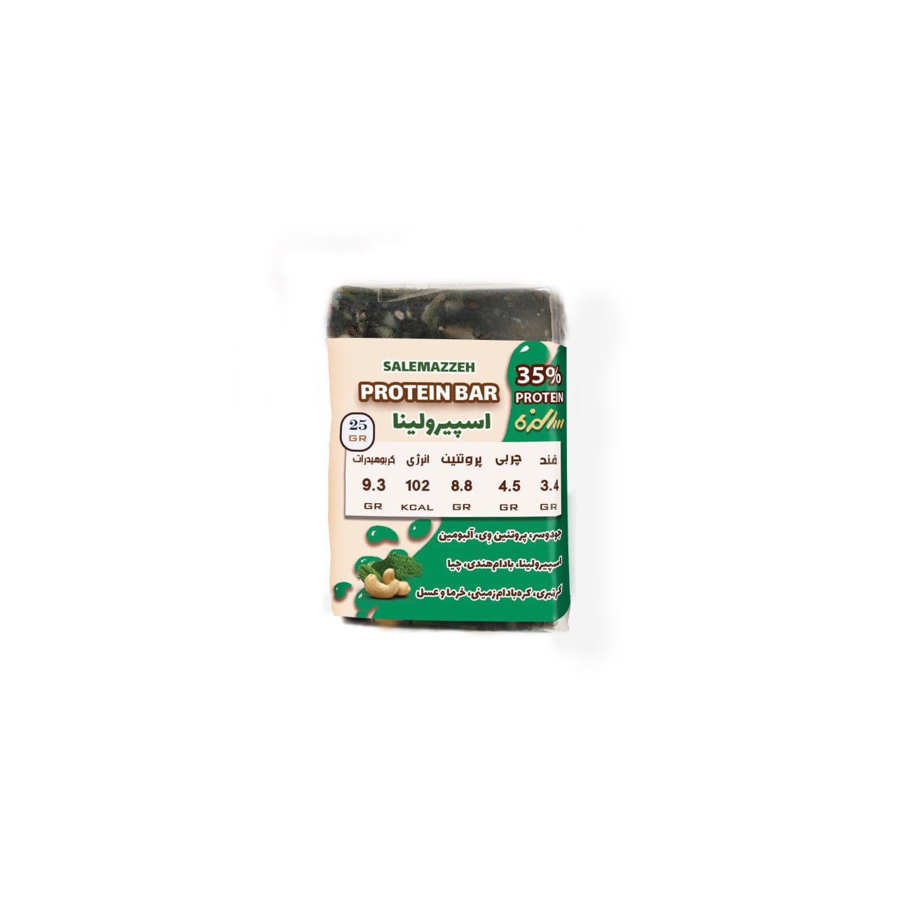 مینیپروتئین بار اسپیرولینا متشکل از جودوسر، پودر پروتئین وی، <strong>سوپرفود اسپرولینا</strong>، کره بادامزمینی، بادام هندی، دانه چیا، عسل، خرما، کرنبری و پودر هِل