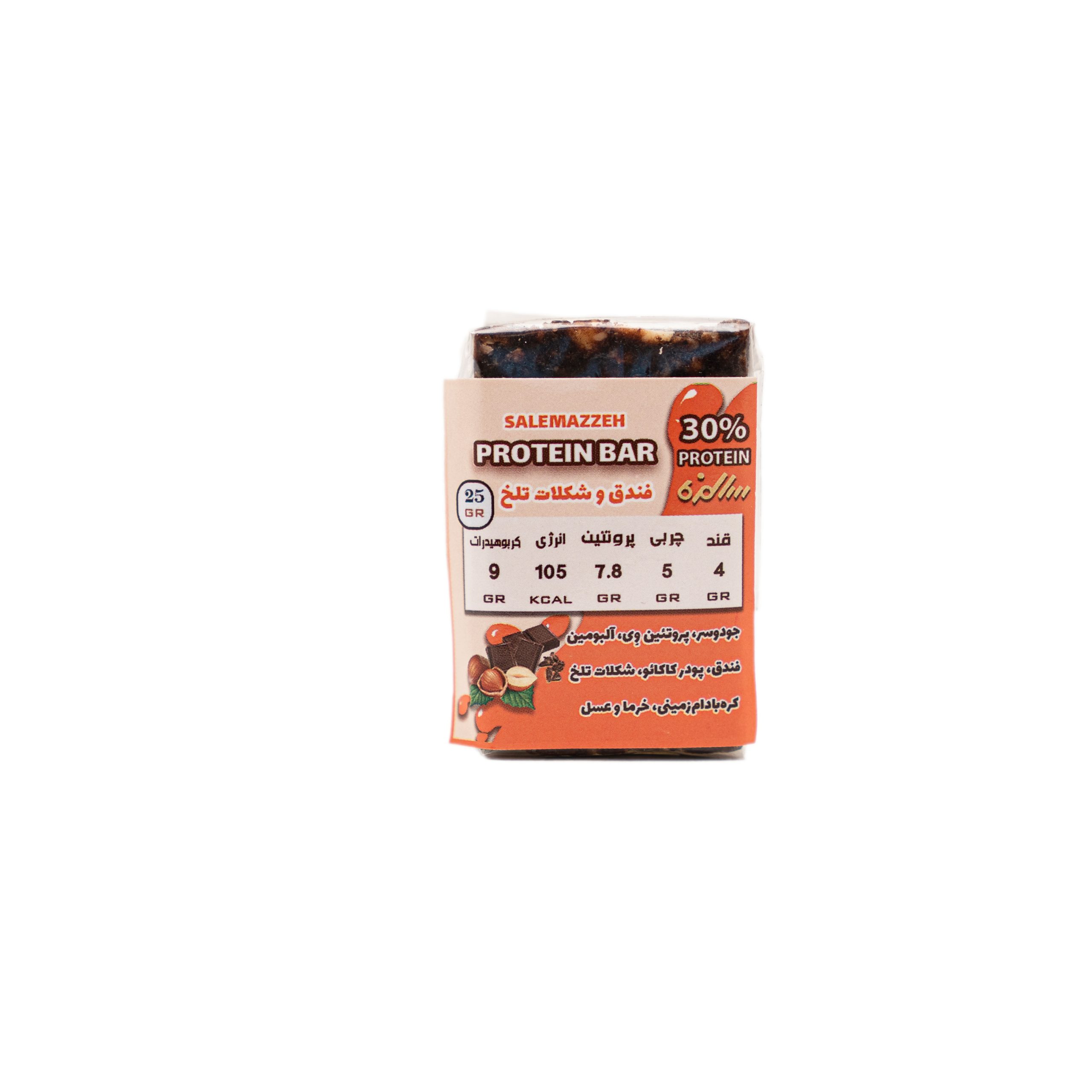 مینیپروتئینبار شکلات و فندق متشکل از: جودوسر، پودر کاکائو، فندق، کره بادام زمینی، عسل، خرماُ، پودر پروتئین وی و شکلات تلخ